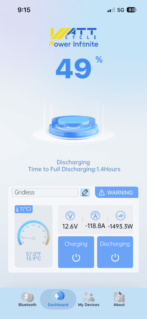 Here you see a screenshot from our WattCycle battery monitor (Bluetooth app). When we run our 1300 W airfryer through the inverter (Victron MultiPlus), the battery has to deliver about 1493 W, which equals roughly 118 A on a 12 V system. This already shows how quickly currents rise when you use high-power 230 V appliances off-grid.